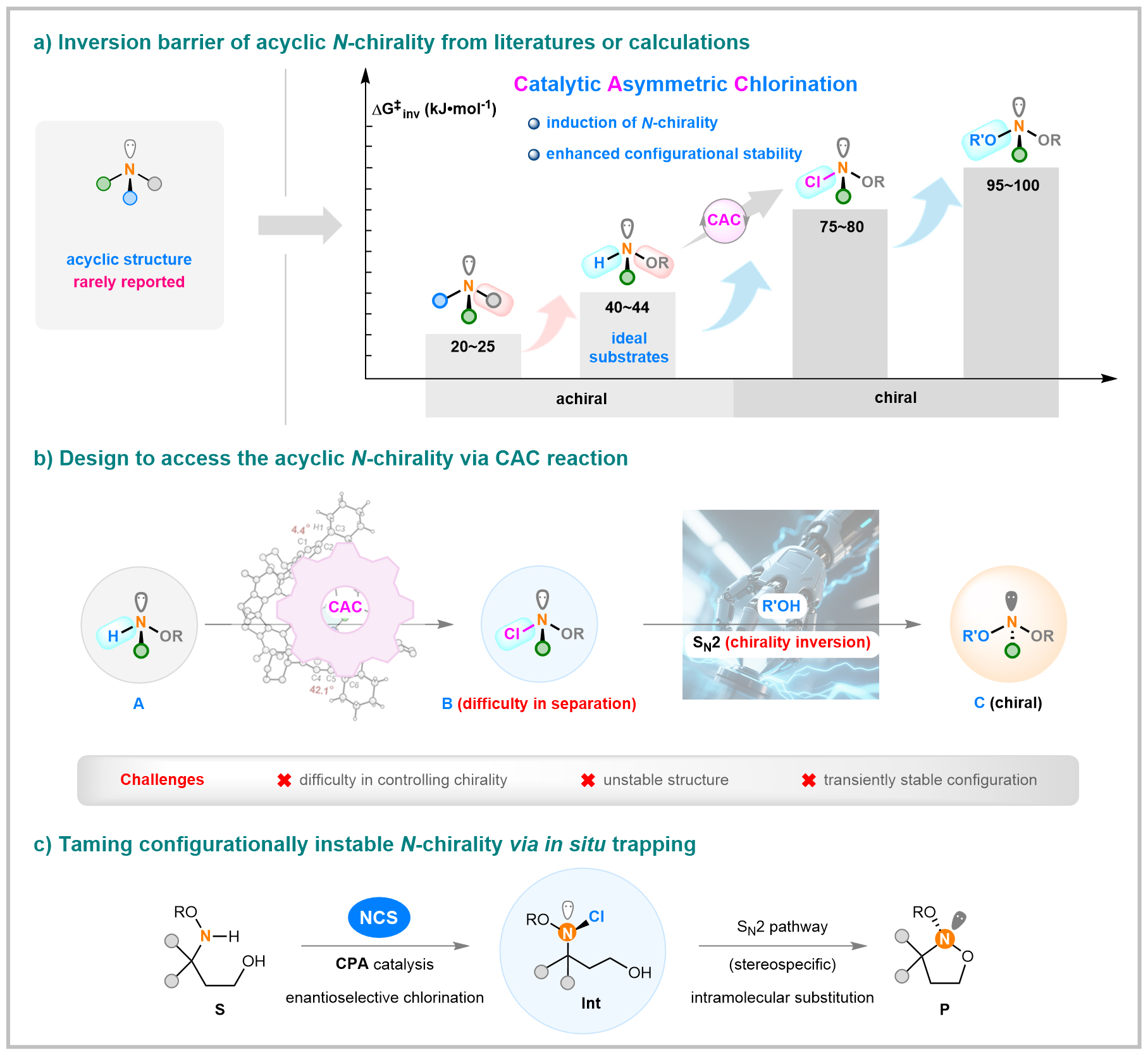 Despite extensive efforts, progress in N-chirality has long been limited to configurational stability and chemical resolution. The low inversion barrier of acyclic N-stereocenters impeded direct asymmetric synthesis, restricting most advances to cyclic systems and often requiring stoichiometric chiral auxiliaries with poor selectivity (Figure 1b). Developing efficient catalytic asymmetric methods for acyclic N-chirality remains a major longstanding challenge.