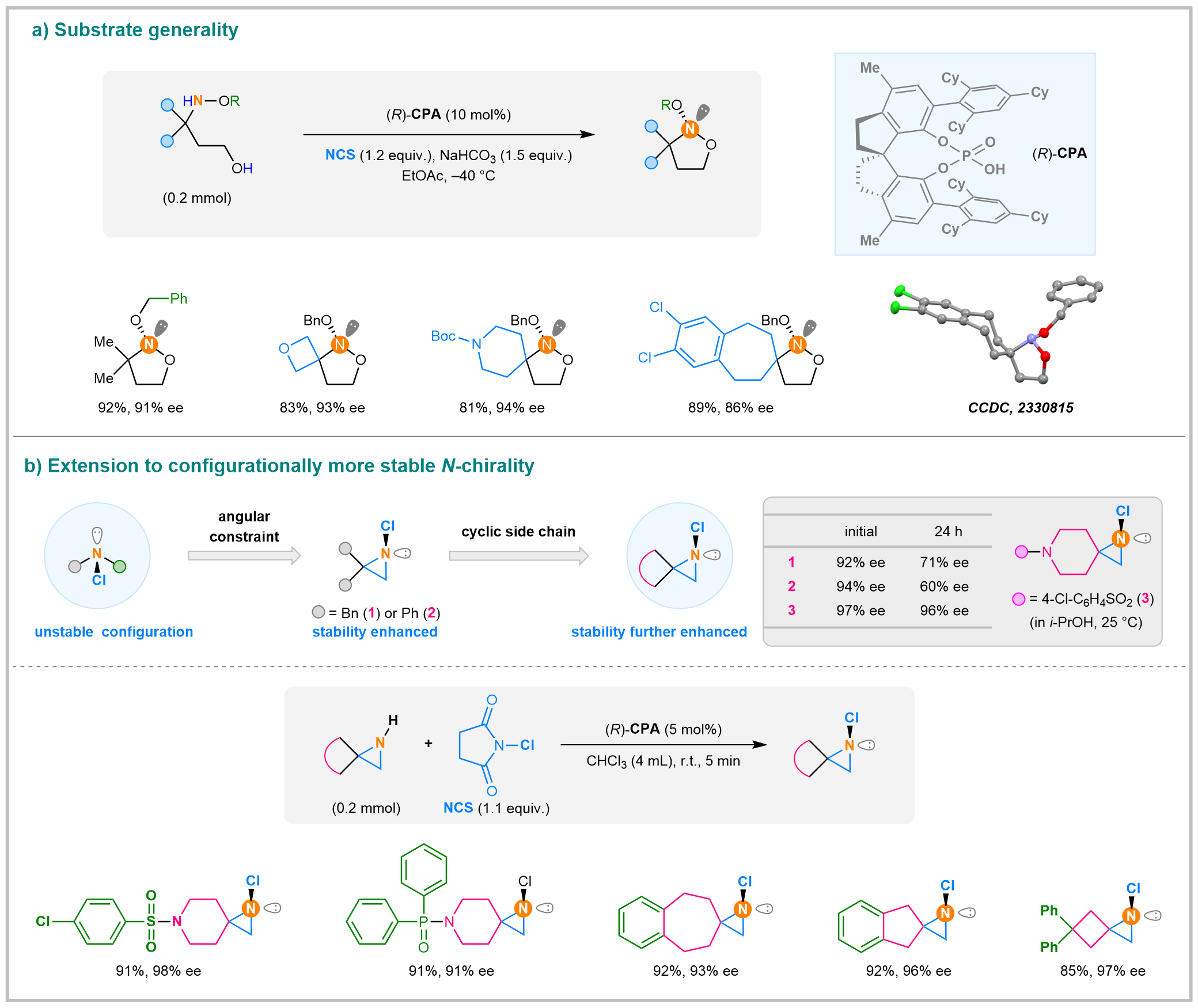 The team employed a sterically hindered chiral phosphoric acid (CPA) as the catalyst. Through a two-step tandem process involving CAC reaction and intramolecular nucleophilic substitution, they successfully achieved highly enantioselective synthesis of N-stereogenic 1,2-oxazolidine compounds bearing nitrogen as the sole chiral element (Figure 3a). This strategy demonstrated broad substrate scope and excellent functional group compatibility. The structures and absolute configuration were unambiguously confirmed by single-crystal X-ray diffraction analysis, which clearly revealed a pyramidal geometry at the nitrogen center.
